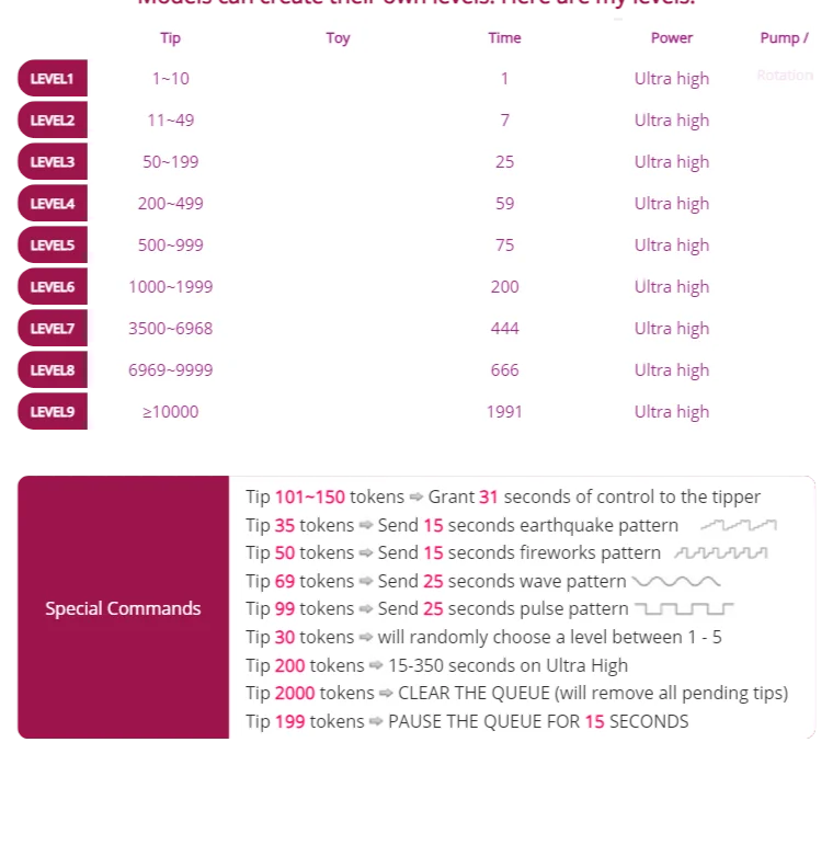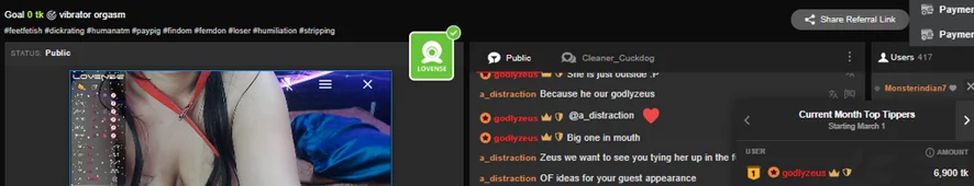 Erotický tanec, Olejová show, Krátká sukně, Exhibicionismus, Twerk, Velbloudí palec, Pokyny k masturbaci, Hodnocení péra, Nylon, Footfetish, different positions, naked, orgasm denial, chastity play, Prstění, Striptýz, Plácání po zadku, sph, joi, feet fetish, femdom, bdsm, role playing, total power exchange, paypig humanatm, cuckold, Anál, Hračky na bradavky, Sexuální hračky, Mezi kozy, Ponižování, Ženský výstřik